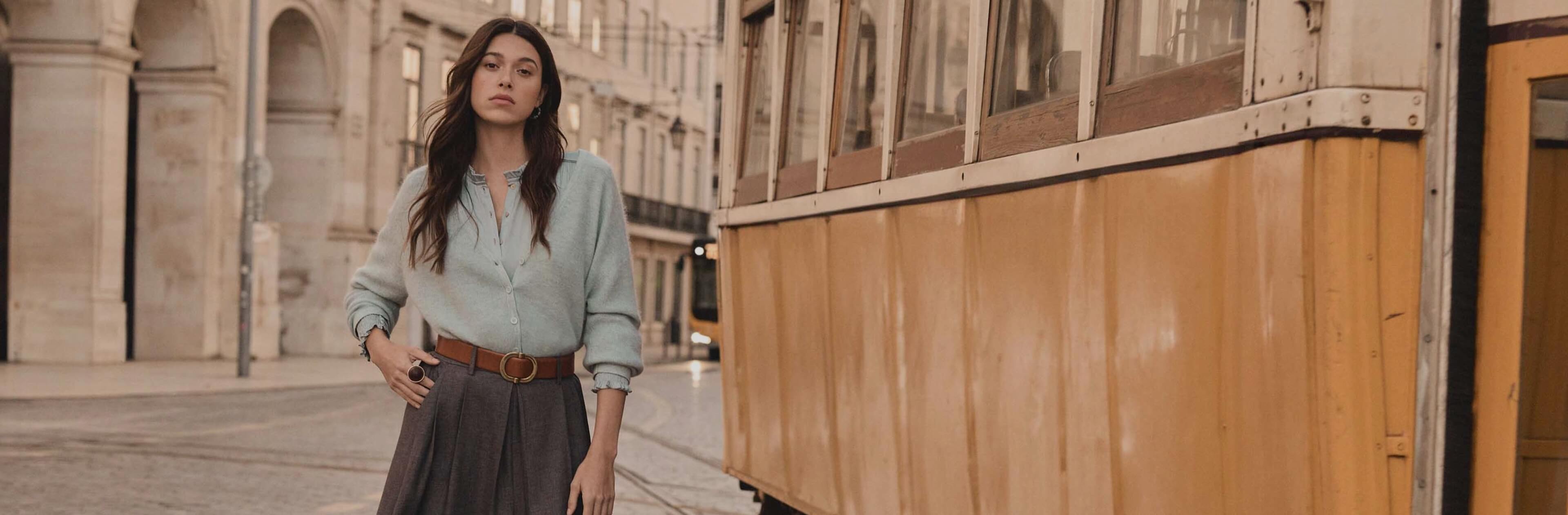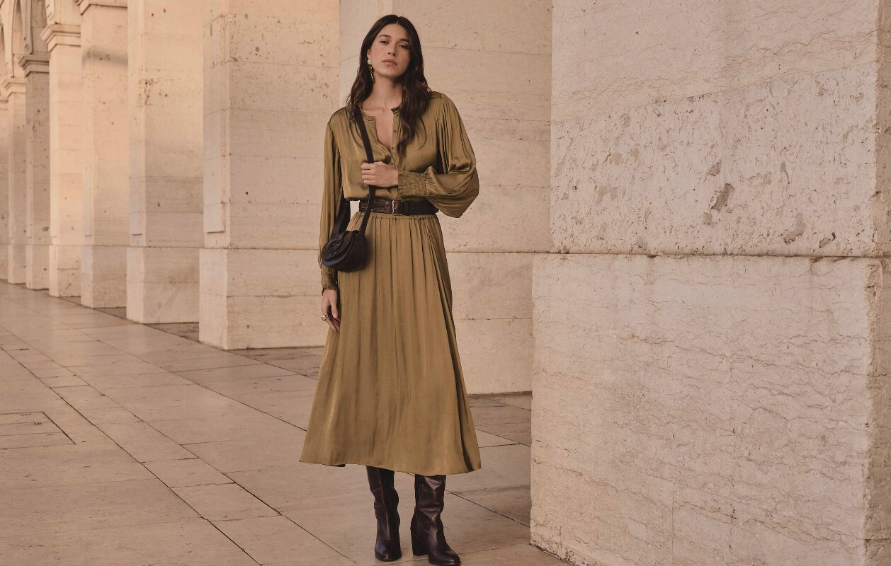 Der lange Rock, zart bohemien, ist ideal, um die Silhouette zu strecken, vorausgesetzt, Sie wählen das richtige Modell. Entscheiden Sie sich für einen fließenden Rock in Wadenlänge und mit hoher Taille, der die Silhouette optisch verlängert. Ein Rock mit einem Schlitz oder einer Knopfleiste, die sich öffnen lässt, ist ein Pluspunkt, da er Ihre Beine zeigt und die Silhouette nicht beschwert. Wenn Sie klein sind, macht die Wahl der Schuhe den Unterschied: Setzen Sie auf schmale Stiefel mit Absätzen, um sich zu strecken und eine schlanke Figur zu schaffen. Oben wählen Sie ein Top oder ein Strickteil, das Sie in den Rock stecken können, um die hohe und sichtbare Taille zu erhalten.