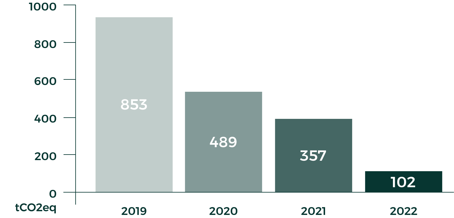 Die Emissionen der Kategorien Scope 1 und 2: direkte Verantwortung (Brennstoffe, Strom...) wurden zwischen 2019 und 2022 um 88% gesenkt