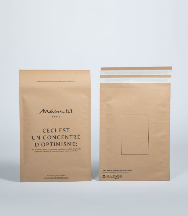 Im Jahr 2020 wurden unsere E-Commerce-Verpackungen neu gestaltet. Wir haben Plastik aus unseren Beuteln eliminiert und uns für recyceltes Kraftmaterial entschieden.